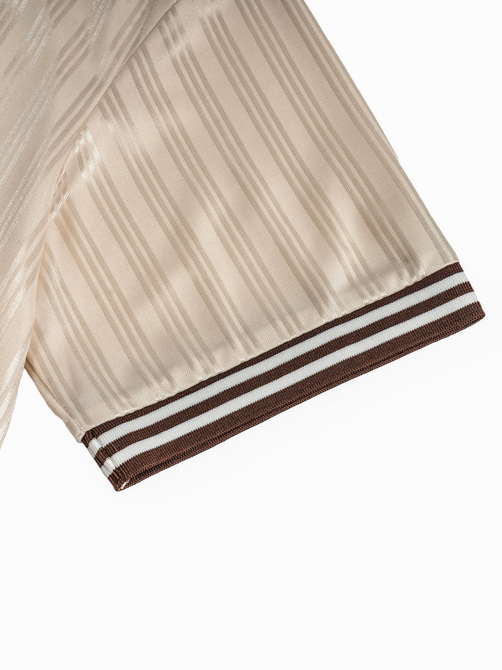 Atelier Detailing: Finished with a structured, ribbed collar (Lapel style) and high-contrast Brown/Cream trim that frames the neck and sleeves, elevating it from "sportswear" to "design object."
